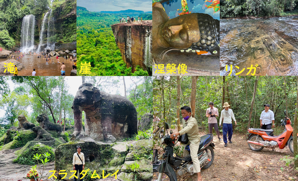 08:00ホテル出発、プノンクレーンのチケット売り場へ 08:10~09:40チケット売り場から崖まで移動、 09:40~10:00崖の見学 10:30~11:00巨大涅槃仏(Reclining Buddha) 11:10~11:40千本リンガー(Thousand Lingas) 11:50~12:30 滝(Waterfalls) 12:30~13:30の近くにあるレストランで昼食をご案内。 13:30~14:30レストランからバイクでスラスダムレイ(Srah Damrei)へ移動 14:30~15:10スラスダムレイ(Srah Damrei)の見学 16:10~18:00ホテルに戻る予定、解散。 |