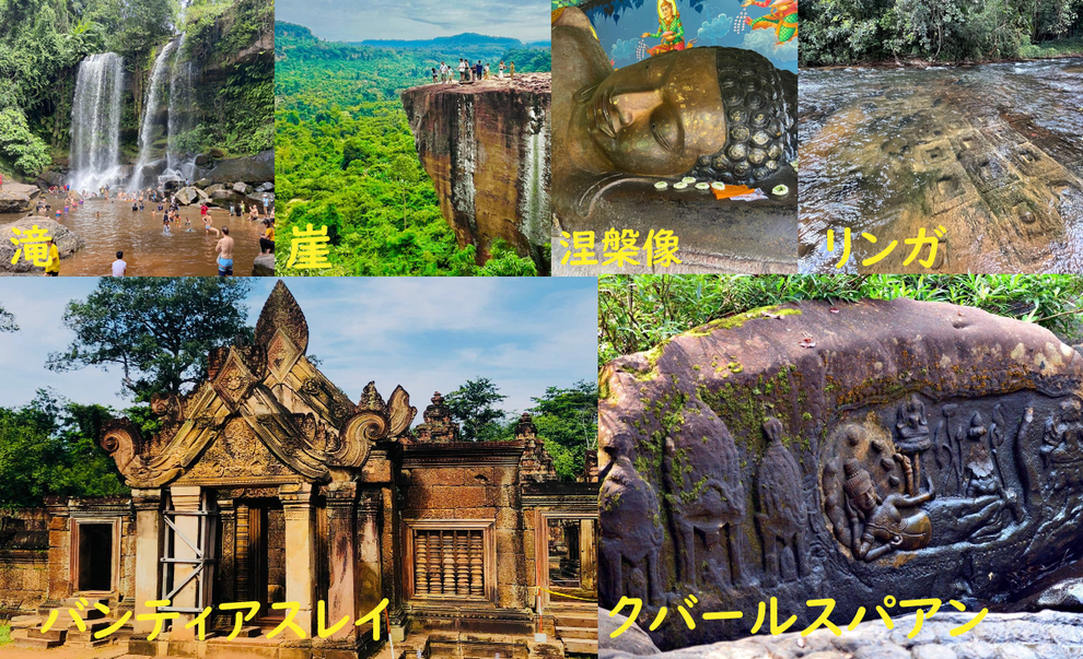 7:00ホテル出発、クバールスパアンへ移動 8:20~10:20クバールスパアンの見学(移動と見学時間) 10:20~11:20クバールスパアンからプノンクレンへ移動 11:20~13:00プノンクレンの見学(崖、涅槃像、滝、1000本のリンガ) 13:00~14:00プノンクレンにあるレストランで昼食をご案内、 14:00~15:00プノンクレンからバンティアスレイへ移動 15:00~16:00バンテアイスレイ遺跡の見学 16:00~17:00バンテアイスレイ遺跡からホテルへ移動 17:00ホテルに着く予定、解散。 |